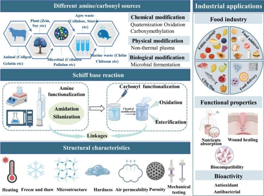 席夫碱因其优异的可调性、动态可逆性和多功能性而日益受到学术界的关注。尽管目前的研究主要集中在其化学应用方面,但关于席夫碱在食品级材料中的优化及其对食品功能性影响的系统性研究仍较为匮乏。本综述探讨了席夫碱的形成机制,包括组分的化学结构、组成及功能性,重点阐述了食品级天然反应物(如蛋白质、多糖和植物化学物质)与合成组分之间的协同相互作用,以及这些作用对材料性能的机理影响。此外,本文还讨论了席夫碱在食品胶体、功能材料和递送系统中的创新应用,特别关注了材料功能性、稳定性和生物相容性之间的平衡,以满足食品工业应用的实际需求。本研究旨在为席夫碱在食品体系中的应用提供有价值的理论支撑,同时为食品保鲜、营养递送和品质提升提供新的见解。未来的研究应进一步探索多样化的反应条件并拓展应用场景,尤其是在可持续绿色食品加工技术领域,以充分释放席夫碱在食品领域的应用潜力。