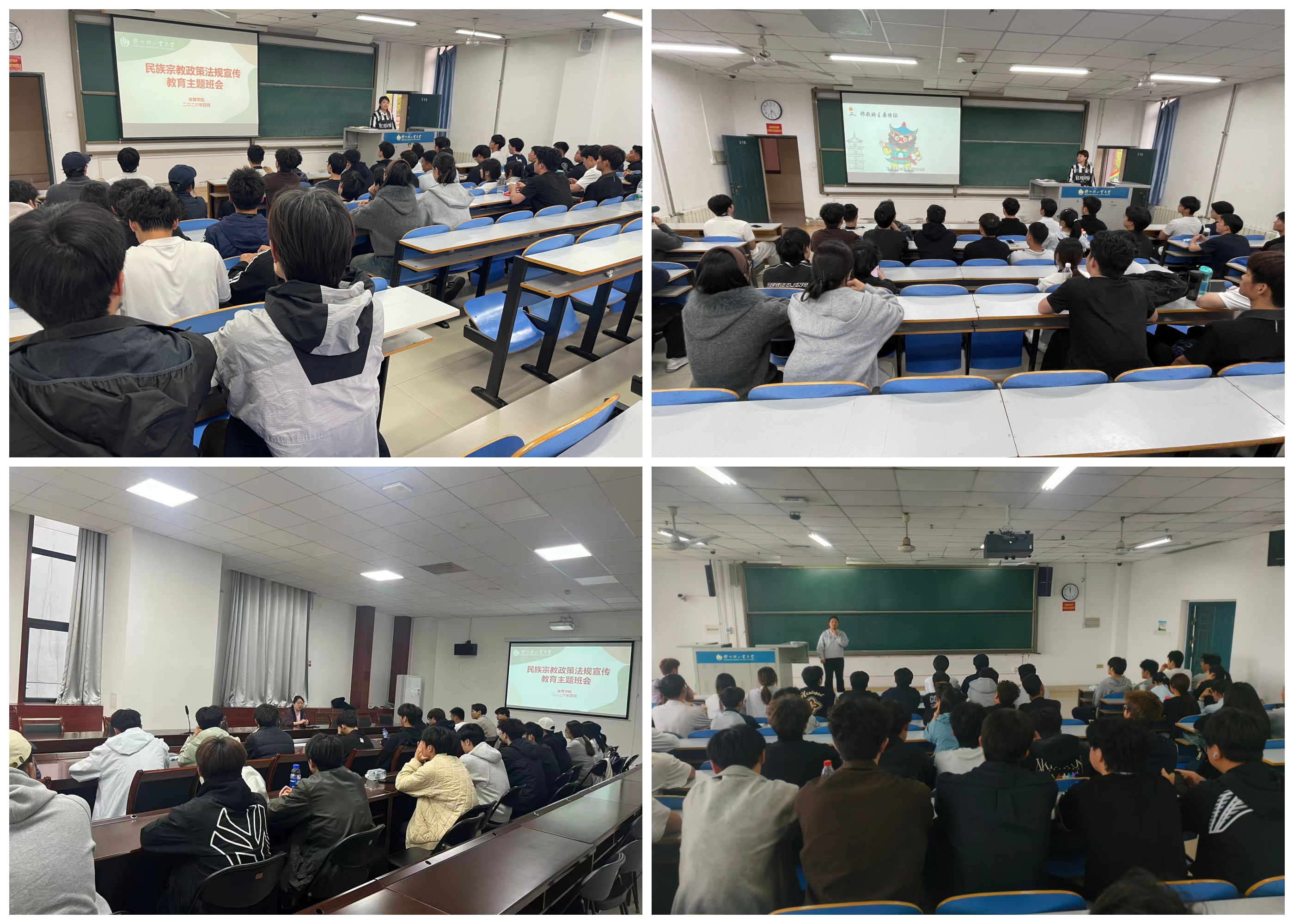 为进一步帮助青年学生准确把握党的宗教工作基本方针,扎实推进校园思想政治引领与民族团结进步教育,4月中旬,体育学院组织各班级召开民族宗教政策法规宣传教育主题班会。