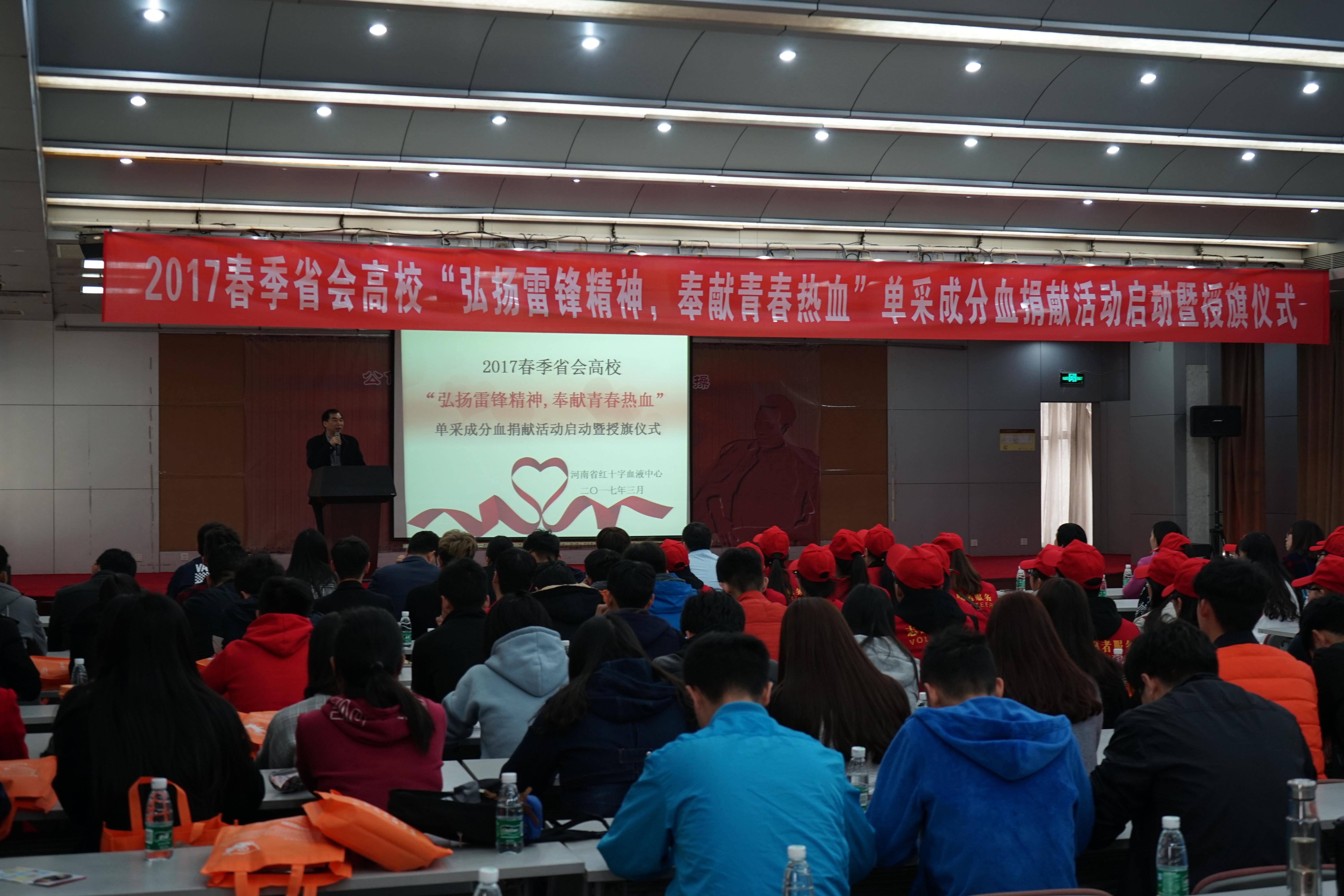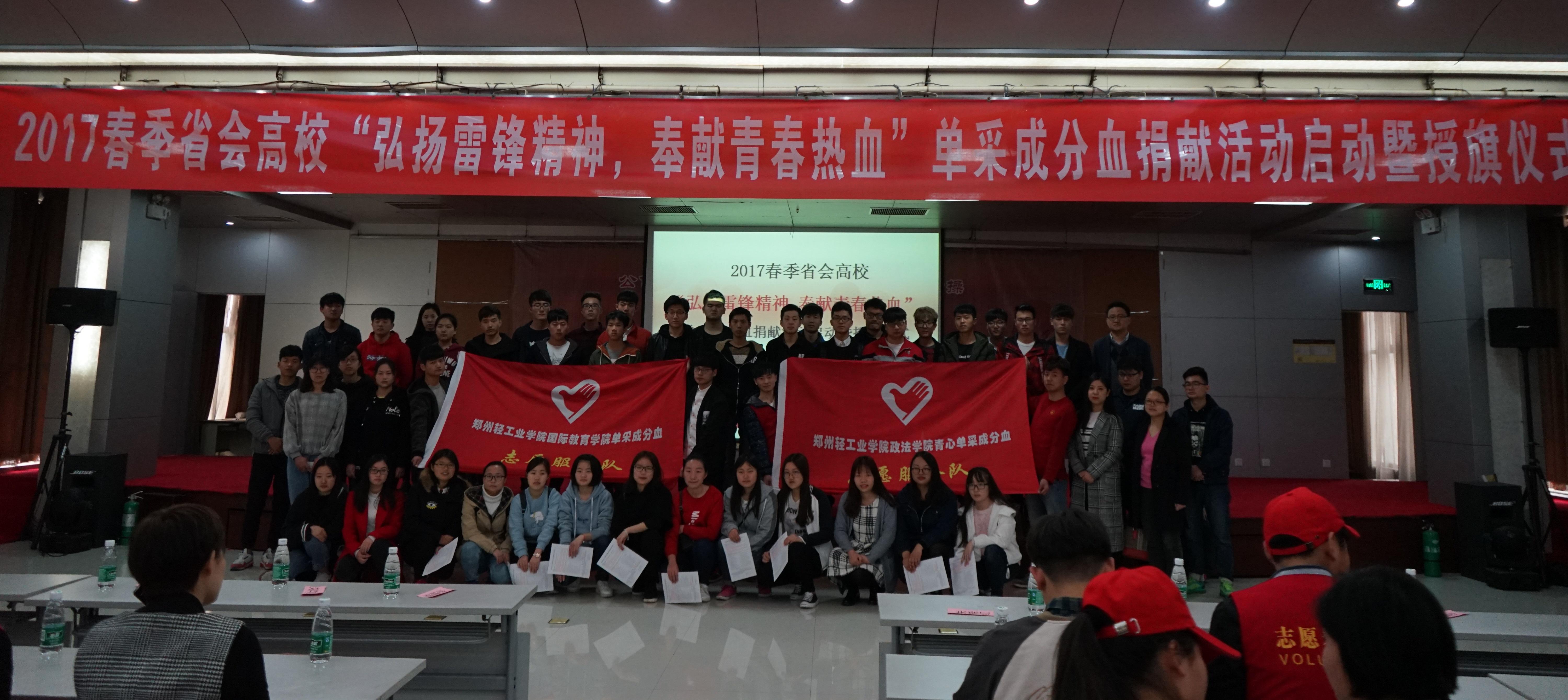 3月11日,河南省红十字会血液中心2017春季省会高校“弘扬雷锋精神,奉献青春热血”单采成分血捐献活动暨授旗仪式在省红十字会血液中心举行,我校政法学院、国际教育学院、青年志愿者协会60余名师生参加了授旗仪式,受邀参加授旗仪式的还有河南牧业经济学院、河南医学高等专科学校和郑州职业铁路技术学院的志愿者师生代表。