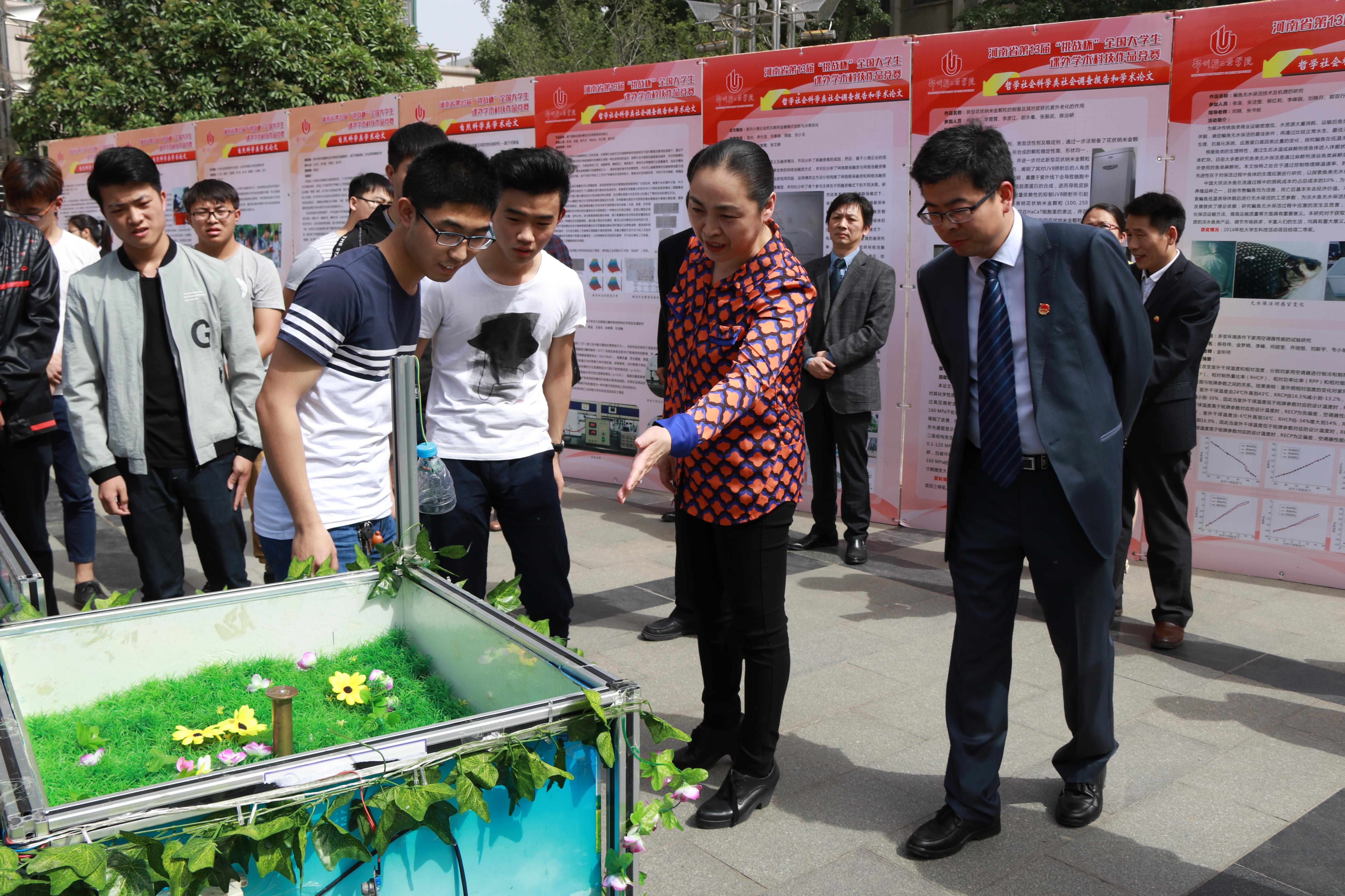 此次成果展示系列主要有三个部分:一是我校共青团工作总体情况介绍及2016年度“十佳团干”、“十佳团员”、“十佳红旗团支部”获奖者风采展示;二是本年度我校参加河南省第十三届挑战杯竞赛的36项项目展示,相应的参赛作品现场操作演示给同学们带来视觉上的体验和冲击;三是我校各校级学生组织和文化、艺术类学生社团介绍和展示,在讲解中伴随现场表演,浓浓的文化艺术气息蕴含其中。在展示的过程中,相应的老师和同学进行了详细的讲解,并对展示实物进行了现场操作,使参观的师生更加清楚我校共青团近年来开展的丰富多彩的第二课堂活动和取得的丰硕成果。先进人物和集体的展示发挥了榜样的引领作用,带领更多的基层团支部和团员青年继续前行,挑战杯作品的介绍激励更多的有志青年博学深思,向着创新创业的大道上迈步前进,丰富多彩的文化艺术陶冶着时代青年的人文素养,做一个伟大“中国梦”的践行者。