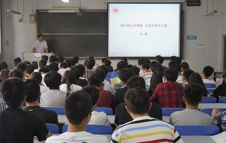 为积极发扬传承“五四”精神,落实校团委关于集中开展“学习习近平总书记讲话,做合格共青团员”教育实践的通知要求,充分发挥团组织教育青年的功能,提升团员思想理论水平, 5月4日下午,建筑环境工程学院邀请校党委宣传部副部长马寒老师走进学生课堂,为青年学子做了《践行社会主义核心价值观,自觉为君子之道》的讲座。建筑环境工程学院全体专兼职辅导员、各班主要团(学)干部100余人聆听了此次讲座。讲座由学院党政办主任董志国老师主持。