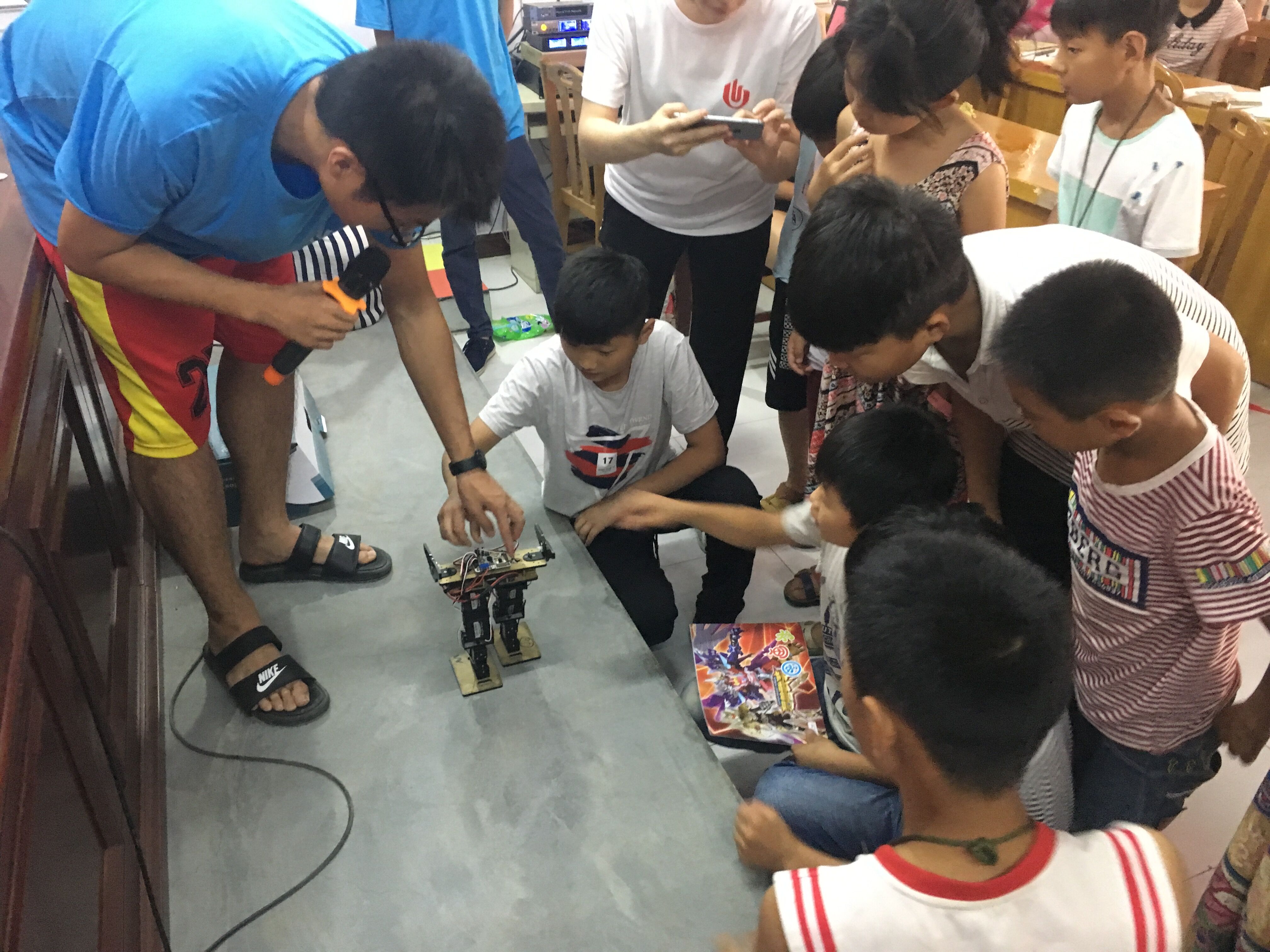 小分队成员为孩子们操作示范机器人