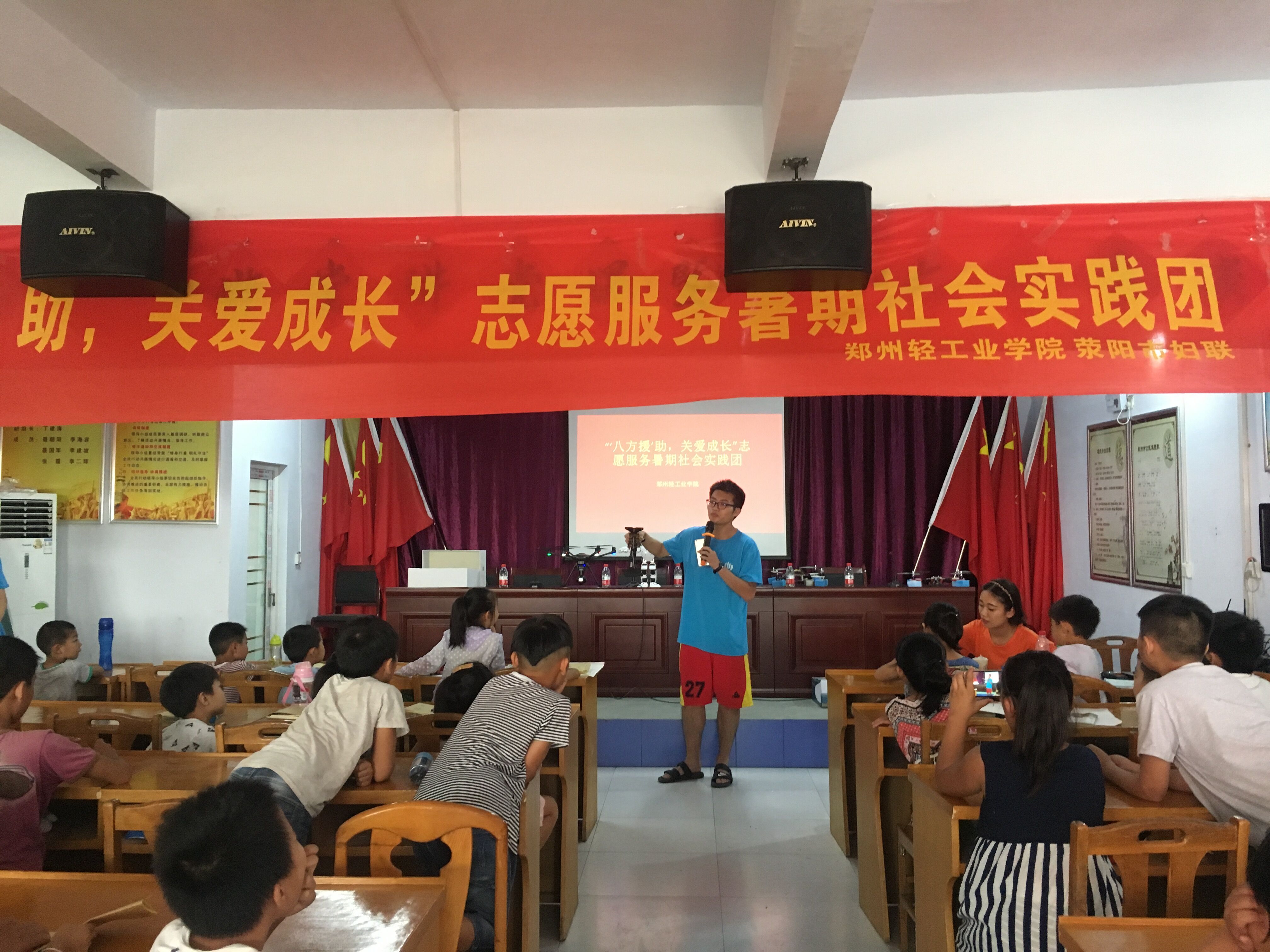 7月10日,小分队到达荥阳市聂楼社区。队员们把自己制作的无人机和智能机器人展示给前来观看的留守儿童,小朋友们对无人机和机器人展现出浓厚的兴趣与积极高昂的热情,并且向队员们提出有关无人机与智能机器人方面的很多问题,队员们针对这些问题为他们一一解答,并普及了相关知识。最后,小分队成员在社区文化中心集中给留守儿童阐述无人机与智能机器人的相关原理和所运用到的知识,在讲解过程中队员们与小朋友们进行了互动。最后小分队成员以及全校各个志愿者队伍与留守儿童进行了合照留念。