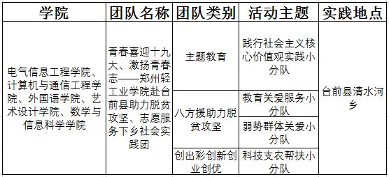 为深入学习宣传贯彻党的十八大和十八届三中、四中、五中、六中全会以及习近平总书记系列重要讲话精神,积极响应校团委号召,发挥专业特色,服务社会,助力精准扶贫工作,提高我校广大青年学生的社会实践能力和组织协调能,并为即将到来的十九大打下良好基础,校团委特组建了郑州轻工业学院“助力脱贫攻坚 志愿服务下乡”社会实践团,由校团委老师和相关二级学院分团委老师以及相关指导老师带领师生近50人团队,于7月9日—11日赴濮阳市台前县清水河乡开展“三下乡”社会实践活动。