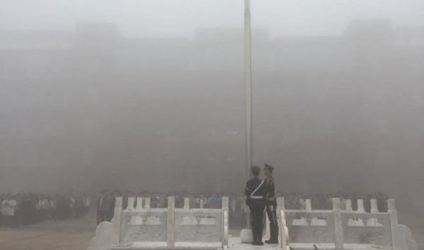 六点四十分,升旗仪式正式开始,学校国旗护卫队迈着铿锵的步伐,护卫着国旗来到广场,全场一片肃静。在激昂的《义勇军进行曲》中,升旗手振臂一挥,鲜艳的五星红旗徐徐展开,在初生的阳光映照下,在全体师生代表的注目中,迎着初升的太阳,迎风飘扬在广场上空。