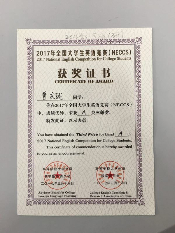 全国大学生英语竞赛(NECCS)是高等学校大学外语教学指导委员会和高等学校大学外语教学研究会组织的全国唯一一个考查大学生英语综合能力的竞赛活动。此次竞赛中,我院2015级研究生李玉可脱颖而出,荣获一等奖、2015级研究生寇冬雪与2016级研究生曾庆珑分获二等奖和三等奖,取得了骄人成绩。