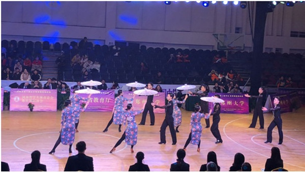 由教育厅主办的河南省第二届学生体育舞蹈锦标赛于12月17日晚在郑州中学落下帷幕,省内26所高校及36所中小学派队参赛。我校艺术教育中心选派39名学生组队参加了高校组的6个项目的比赛,经过两天紧张比赛,最终我校5个项目的选手进入决赛,分别获得了不同组别的冠军、亚军、季军和第四名、第六名的好成绩。