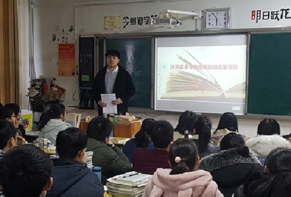 经济与管理学院组织学生志愿者到驻马店泌阳县郭集乡和开封市兰考县南彰镇王茂店的建档立卡贫困生家庭分别进行了走访,深入了解受访学生家庭经济状况和受助需求;计算机与通信工程学院(电子信息工程学院)学生资助工作小组成员,深入农村,走进学校,慰问走访,进行资助工作温暖帮扶和学生资助政策宣讲活动;建筑环境工程学院学生志愿者前往新乡县对2015级建档立卡贫困生进行走访慰问,送去了米、面、油等慰问品以及新春的祝福,让贫困学生和家长感受到了来自学校大家庭的温暖;材料与化学工程学院摸底了解寒假返乡家庭经济困难学生面临的困难,重点关注因经济困难无力购买返程车票、但渴望返乡过年的学生,为部分学生申请路费资助,帮助他们顺利回家与亲人团聚;软件学院受助学生志愿者将《河南省高校学生资助手册》和我校奖助政策告知书捐赠给其所在的居委会、村委会以及高中学校,以此激励学弟学妹们把握好时间,努力学习,希望他们能够刻苦学习,实现理想,立志为社会、为国家贡献自己的力量,同时也要牢记党和国家对于贫困学子的关怀和支持。
