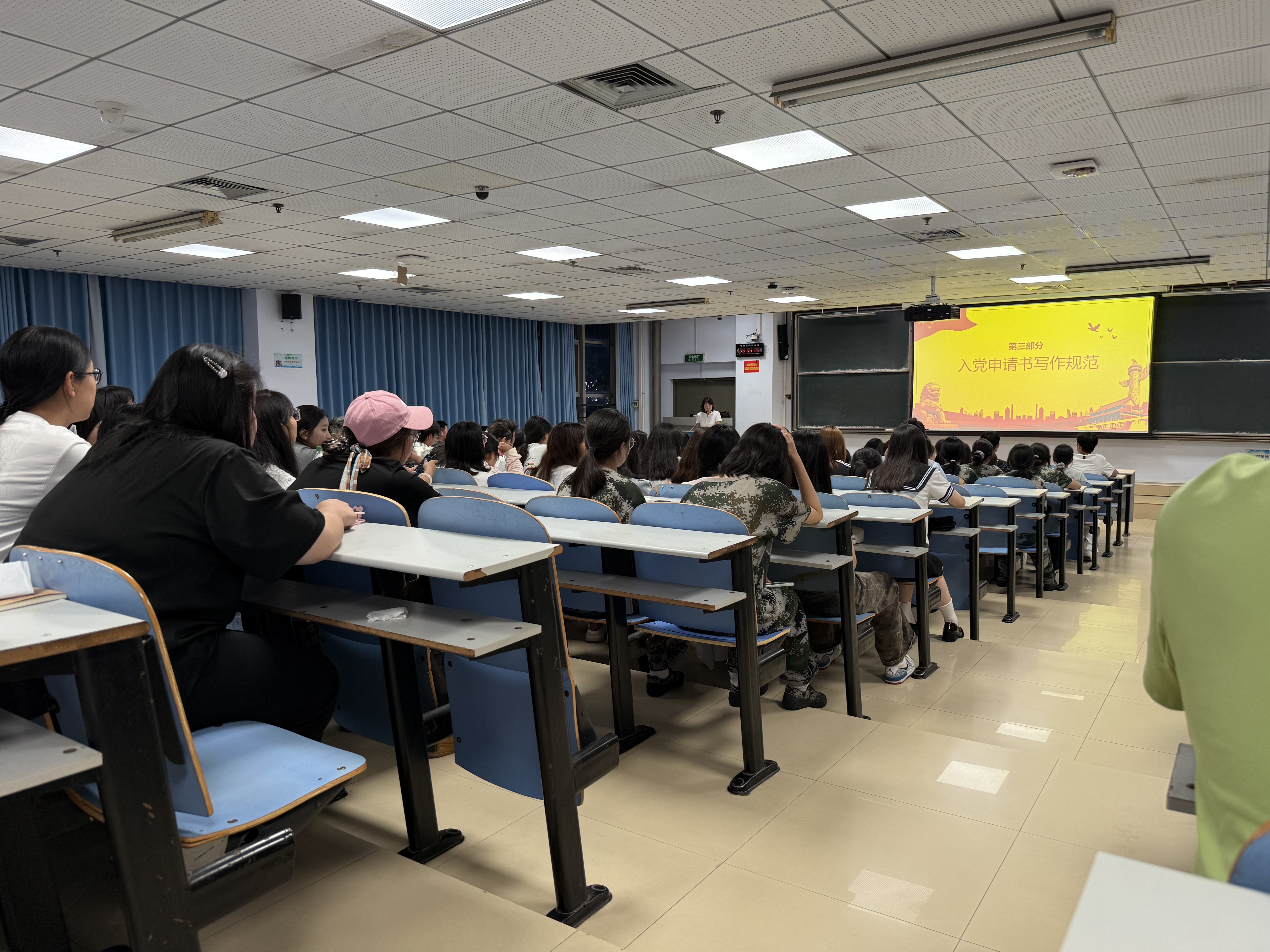 讲座围绕“中国共产党的相关知识”“入党程序”“入党申请书的写作规范”三个方面展开讲解,详细阐述了党的性质、宗旨、指导思想以及党员的权利和义务。在入党程序方面,主讲老师按照时间顺序,从递交入党申请书开始,依次介绍了成为入党积极分子、发展对象、预备党员以及正式党员的各个阶段和具体要求。针对入党申请书的写作规范,讲座给出了具体指导并展示优秀模板。同学们认真聆听,积极记录。不少同学表示,他们对入党有了更全面的认识,明确了自己的努力方向,今后将以实际行动积极向党组织靠拢。