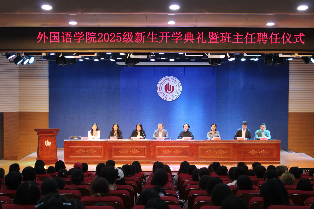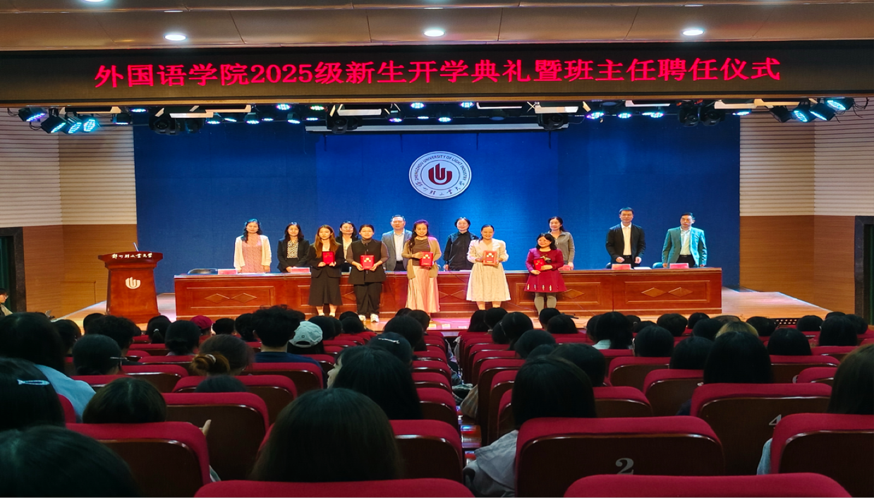 9月26日下午,外国语学院在东风校区教一楼107演讲厅隆重举行2025级新生开学典礼暨班主任聘任仪式。学院领导班子成员、系部主任、班主任、辅导员及2025级本科生、研究生参加,典礼由学院党委副书记马宇主持。