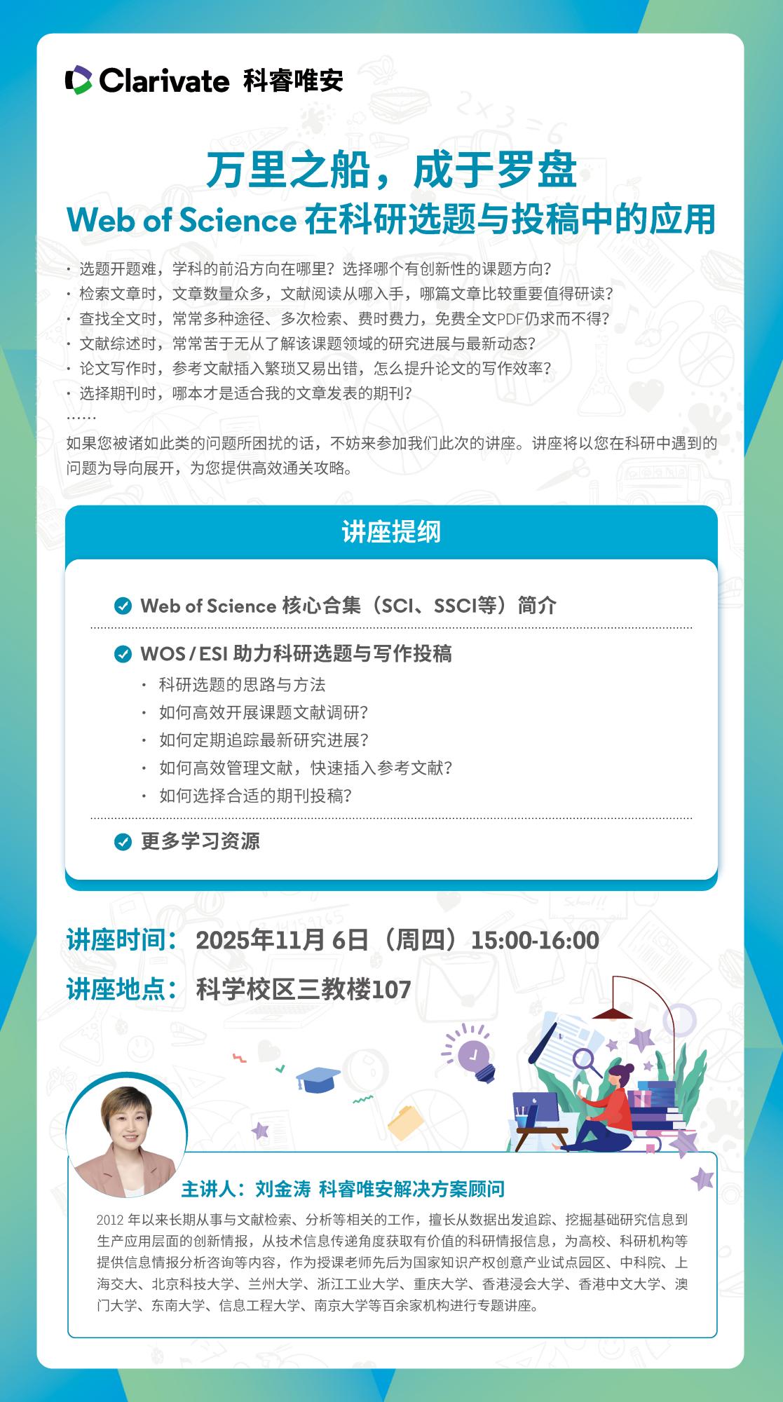 为助力我校师生高效运用Web of Science平台提升科研能力,破解科研实践中的痛点问题,图书馆联合科睿唯安举办“Web of Science在科研选题与投稿中的应用”专题讲座。现将具体事宜通知如下: