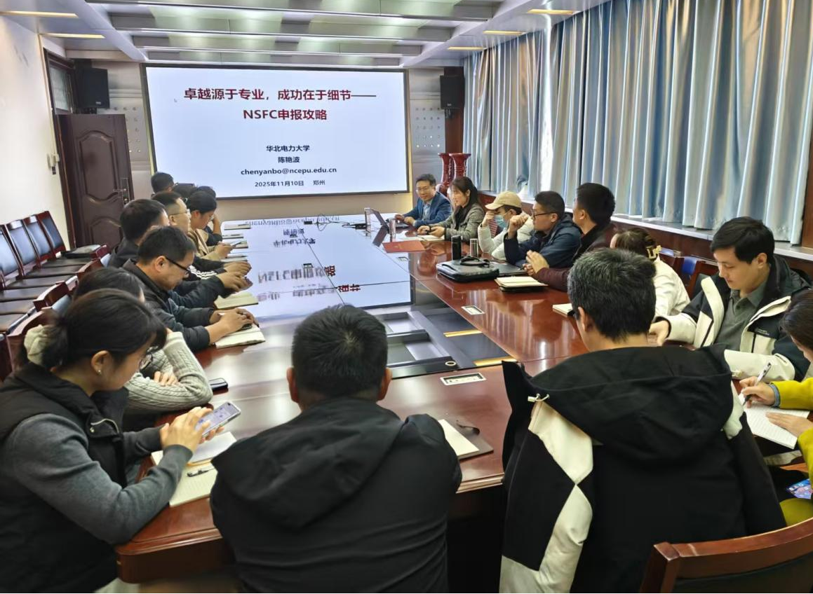 2025年11月10日下午,应电气信息工程学院邀请,华北电力大学电气与电子工程学院陈艳波教授在西二楼301会议室开展国家自然科学基金申报专题讲座。讲座由和萍院长主持,2026年申报国家自然科学基金的老师参加本次讲座。