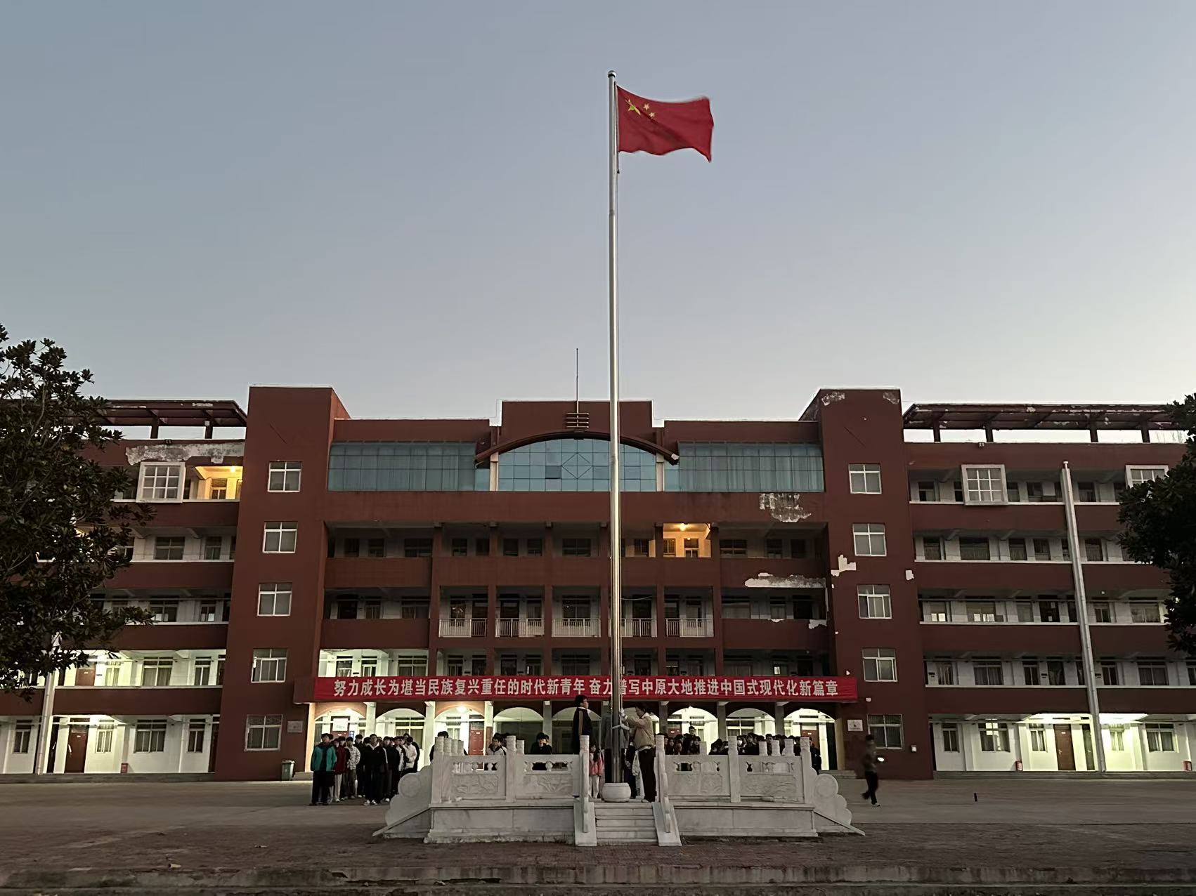 晨曦微熹,寒意渐消,师生们身着整齐着装,精神抖擞地汇聚于升旗台前,脸上洋溢着对国旗的崇敬与对文化的热忱。清晨6 时 40 分,升旗仪式准时启动。国旗护卫队队员身着挺拔制服,迈着铿锵有力的步伐,昂首阔步护送五星红旗走向升旗台。伴随着雄壮激昂的《义勇军进行曲》,五星红旗缓缓升起、猎猎飘扬,全场师生肃立注目,目光追随着国旗攀升,心中涌动着爱国情怀与文化自豪。