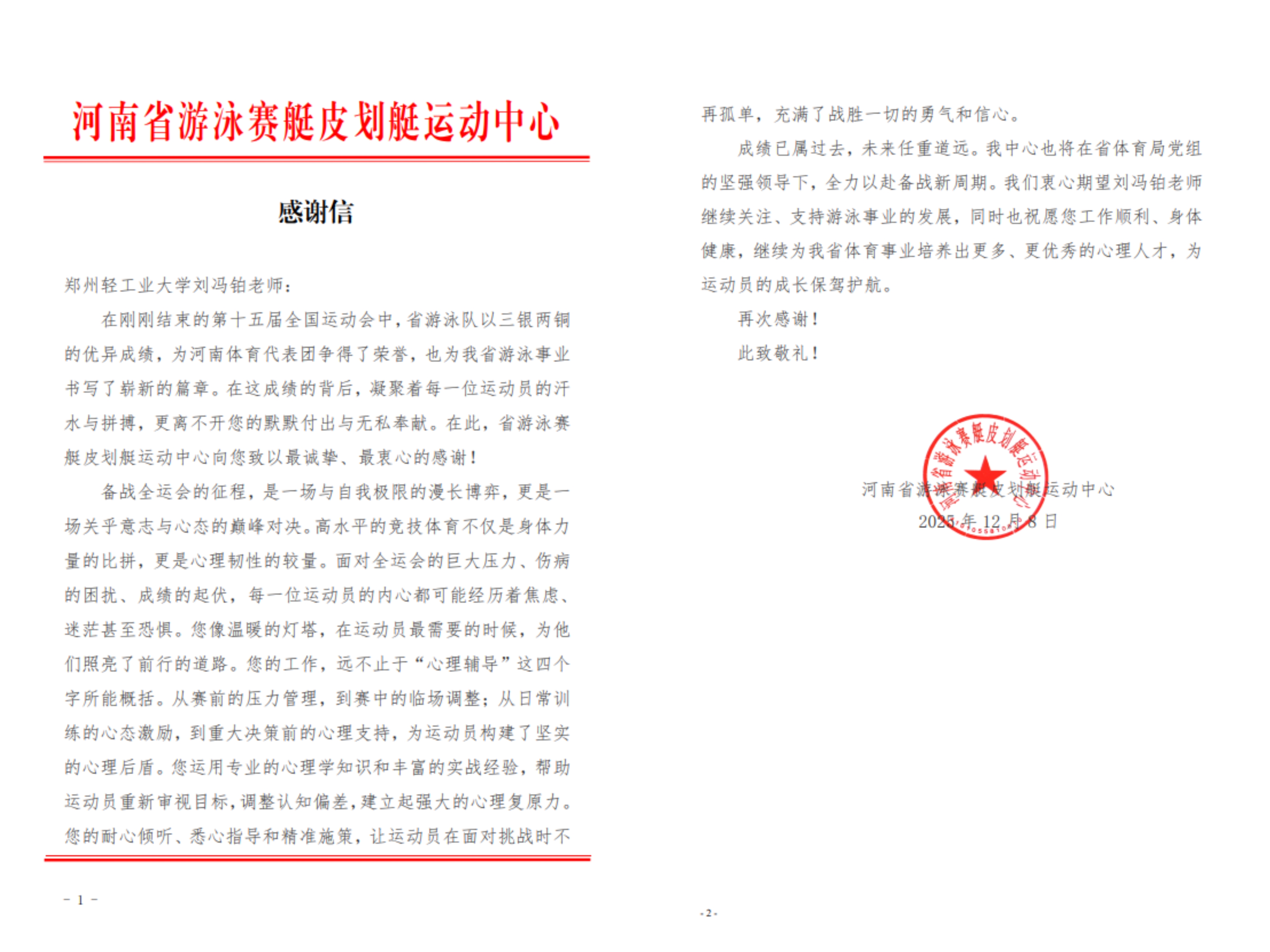 2025年12月8日,我校收到了河南省游泳赛艇皮划艇运动中心发来的感谢信。其中对体育学院担任心理辅导师的刘冯铂老师表达了感谢。来信如下: