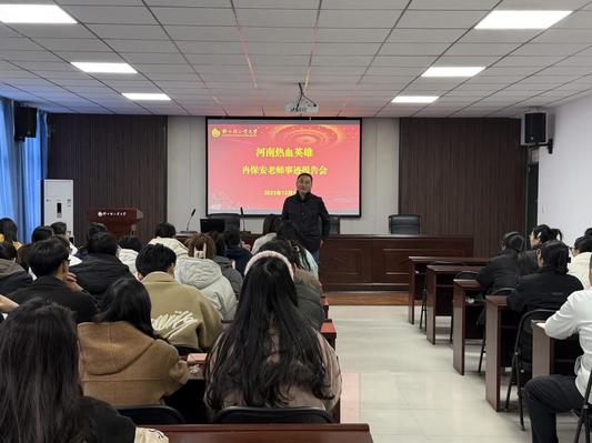 冉保安是学校后勤保障服务中心的一名普通职工,却在无偿献血的善举中展现出不凡的坚持与大爱。二十年来,他累计献血361次,献血总量超过16万毫升,相当于40余位成年人的血液总量。因其突出贡献,他曾两次荣获国家卫生部、中国红十字总会、中国人民解放军总后勤卫生部联合颁发的“全国无偿献血奉献奖金奖”,2015年被授予“献血者先进个人”,2016年被评为校“最美轻大人”,2023年荣获“河南热血英雄”称号。 报告中,冉保安深情回顾了自己从偶然接触献血到二十年如一日坚持奉献的心路历程。他表示,献血不仅救助了无数生命,也让自己养成了健康的生活习惯,树立了积极向上的人生态度。他结合自身经历,鼓励同学们规律作息、坚持锻炼,并详细介绍了无偿献血的社会意义与相关政策。在互动提问环节,同学们围绕献血条件、注意事项等踊跃提问,冉老师一一耐心解答,为有意参与献血的同学提供了切实可行的指导。