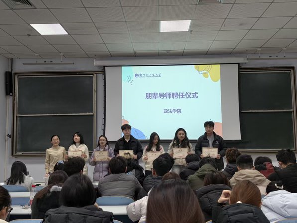 为健全学业指导与朋辈引领长效机制,深化全员、全过程、全方位育人格局,近日,政法学院在东风校区教三楼204举办“心有榜样 行随朋辈”导师聘任仪式。辅导员、朋辈导师及2025级本科生参加。