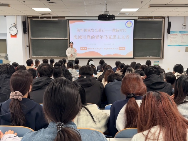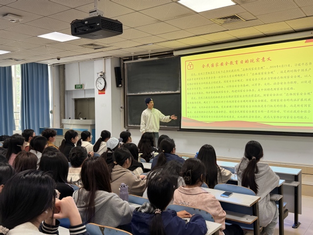 活动中,主讲人从国家安全概念认知、当前安全形势、青年责任担当、实践践行路径四个维度展开系统讲解,清晰阐释了国家安全的定义与内涵,深入解读总体国家安全观“以人民安全为宗旨,以政治安全为根本,以经济安全为基础”的核心要义,全面介绍了政治安全、国土安全、经济安全、网络安全、数据安全、生物安全等重点领域,帮助同学们构建完整的国家安全知识体系。针对当前复杂多变的国际国内安全形势,主讲人对比分析传统安全与非传统安全的差异,结合网络诈骗、信息泄露、不当言论传播、非法拍摄涉密信息等身边真实隐患,让同学们直观认识到国家安全就在身边、安全风险无处不在,切实增强忧患意识与防范意识。活动强调青年是国家安全的参与者、守护者与建设者。作为新时代新青年,要自觉当好国家安全的学习者、传播者、守护者,把国家安全责任融入日常学习生活,规范网络行为、抵制不良信息、严守法律底线、提升辨别能力,发现危害国家安全行为时及时主动报告。