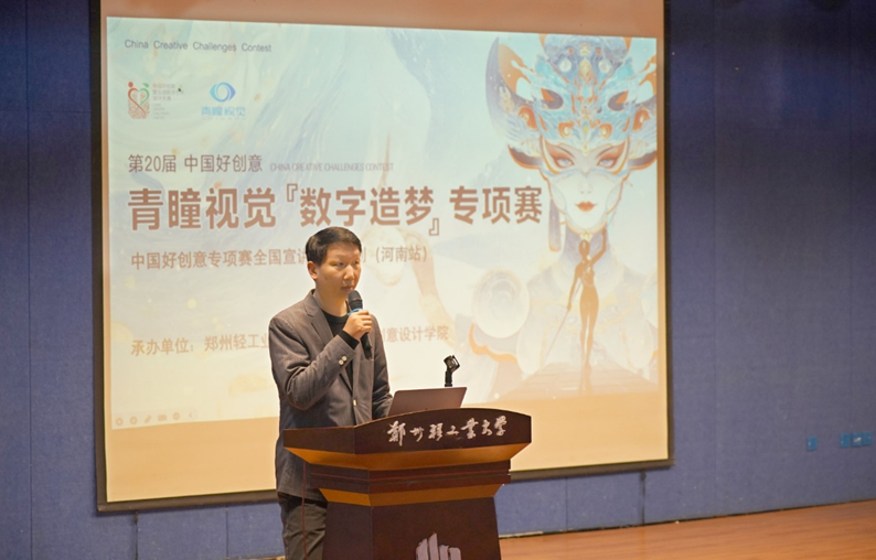 近日,第20届中国好创意暨全国数字艺术设计大赛青瞳视觉“数字造梦”专项赛河南宣讲会在郑州轻工业大学东风校区教一楼演讲厅举行。本次宣讲会由中国好创意暨全国数字艺术设计大赛组委会主办,郑州轻工业大学数字科技与创意设计学院、上海青瞳视觉科技有限公司承办,河南轩明计算机技术服务有限公司协办。青瞳视觉教育事业部总经理许航、河南轩明计算机技术服务有限公司总经理董卫轩、数字科技与创意设计学院执行院长卢建洲、副院长王潇、国际联合仿真实验室主任张搴,以及学校数字媒体艺术专业师生和省内十余所兄弟院校的师生代表参加了此次宣讲会。活动由数字媒体艺术系主任张博文主持。
