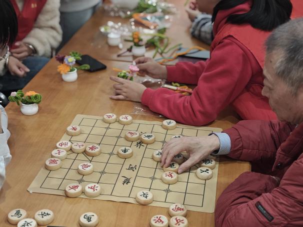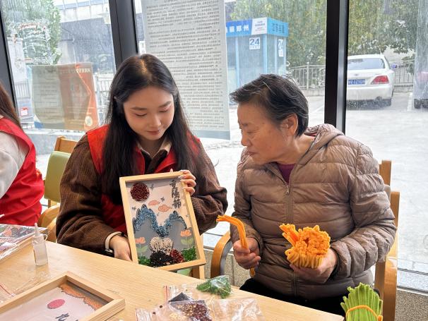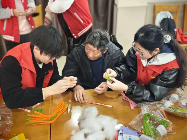 活动中,志愿者们与老人亲切交谈、开展棋艺比拼,一同制作艾草香囊、扭扭棒花和五谷画,现场欢声笑语,温情洋溢。在才艺展示环节,同学们合唱《没有共产党就没有新中国》《感恩的心》《外婆的澎湖湾》等经典曲目,赢得了老人们阵阵掌声。此外,志愿者们还协助整理房间、普及防诈骗知识,并送上牛奶、桃酥等慰问品,以实际行动营造出温暖和谐的节日氛围。整场活动温馨而融洽,老人们脸上洋溢着幸福的笑容,同学们也在志愿服务中深切体会到奉献的快乐与价值。