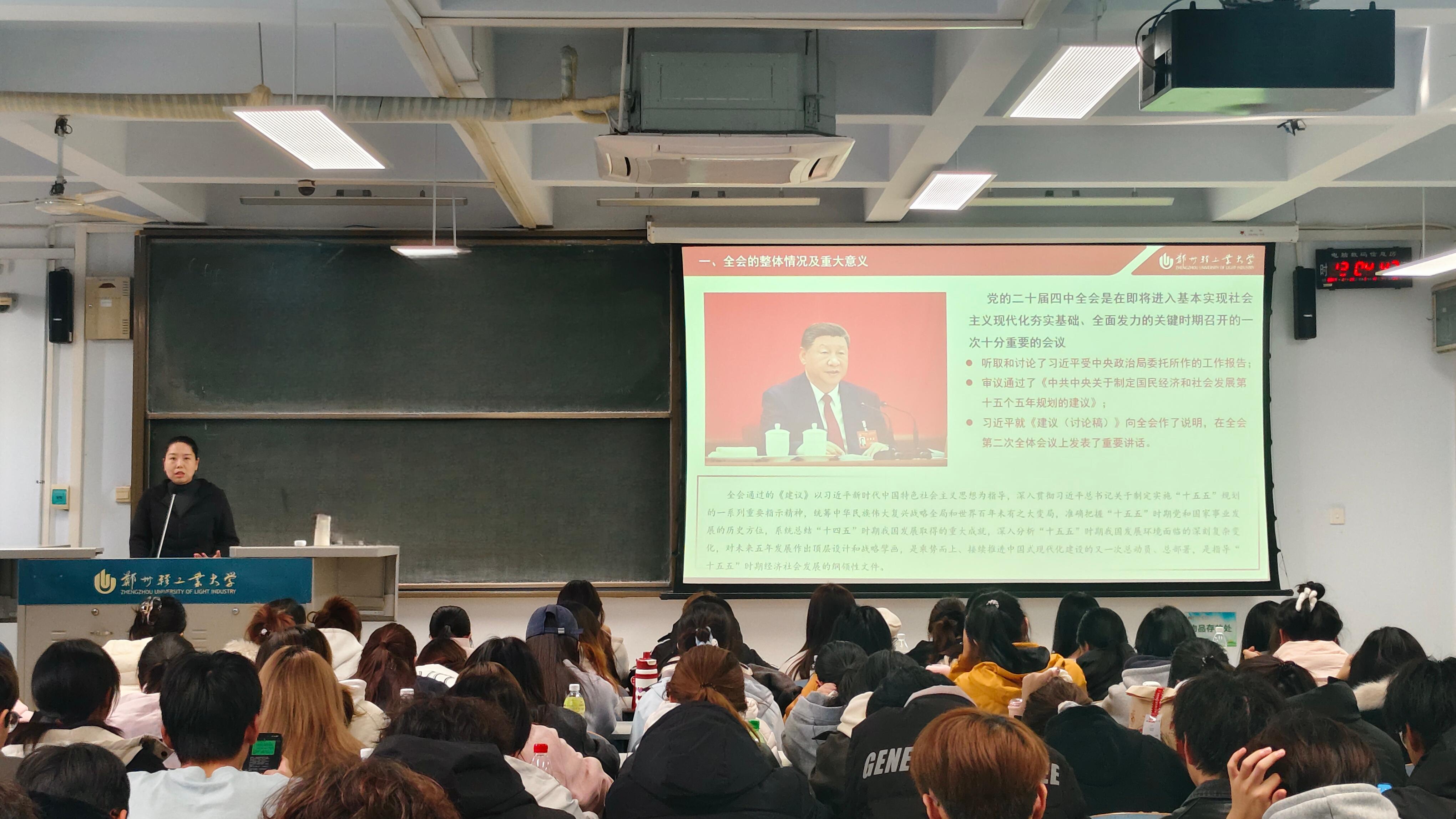 宣讲会上,苏老师深入解读了全会审议通过的《中共中央关于制定国民经济和社会发展第十五个五年规划的建议》,系统阐述了“十五五”时期的战略定位、指导方针、主要目标、重点任务与根本要求,尤其聚焦科技自立自强、发展新质生产力、建设美丽中国、推进共同富裕等关乎国家发展全局的重大部署。同时,她还立足国内外发展形势,深刻阐明了党的二十届四中全会的现实意义与历史影响,引导青年学子从国家发展大局中明确自身责任,在时代发展浪潮中找准奋斗方向。