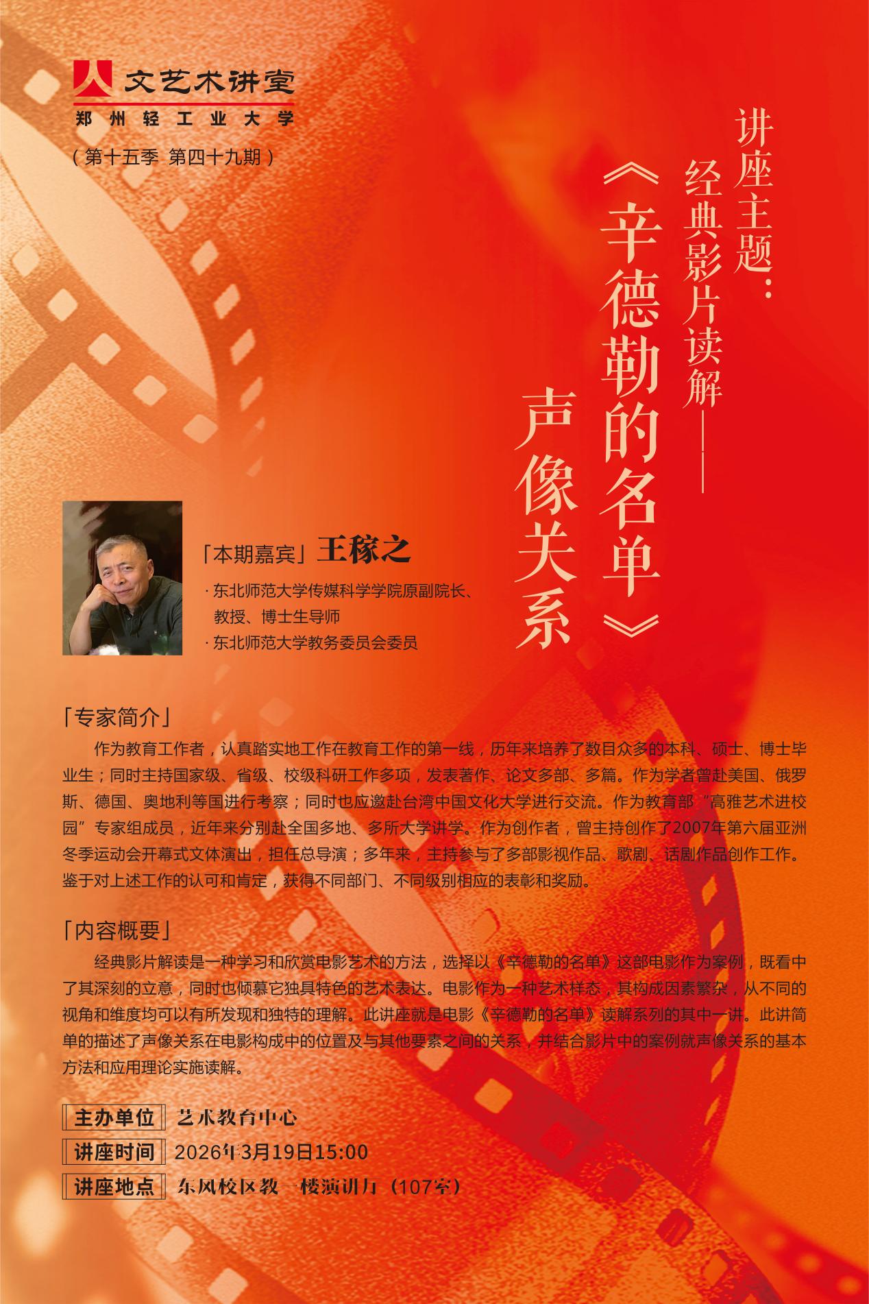 东北师范大学传媒科学学院原院长,博士生导师,王稼之教授,于2026年3月19日(周四)下午15:00,在东风校区教一楼演讲厅(107室),开展题为经典影片读解——《辛德勒的名单》声像关系的讲座。