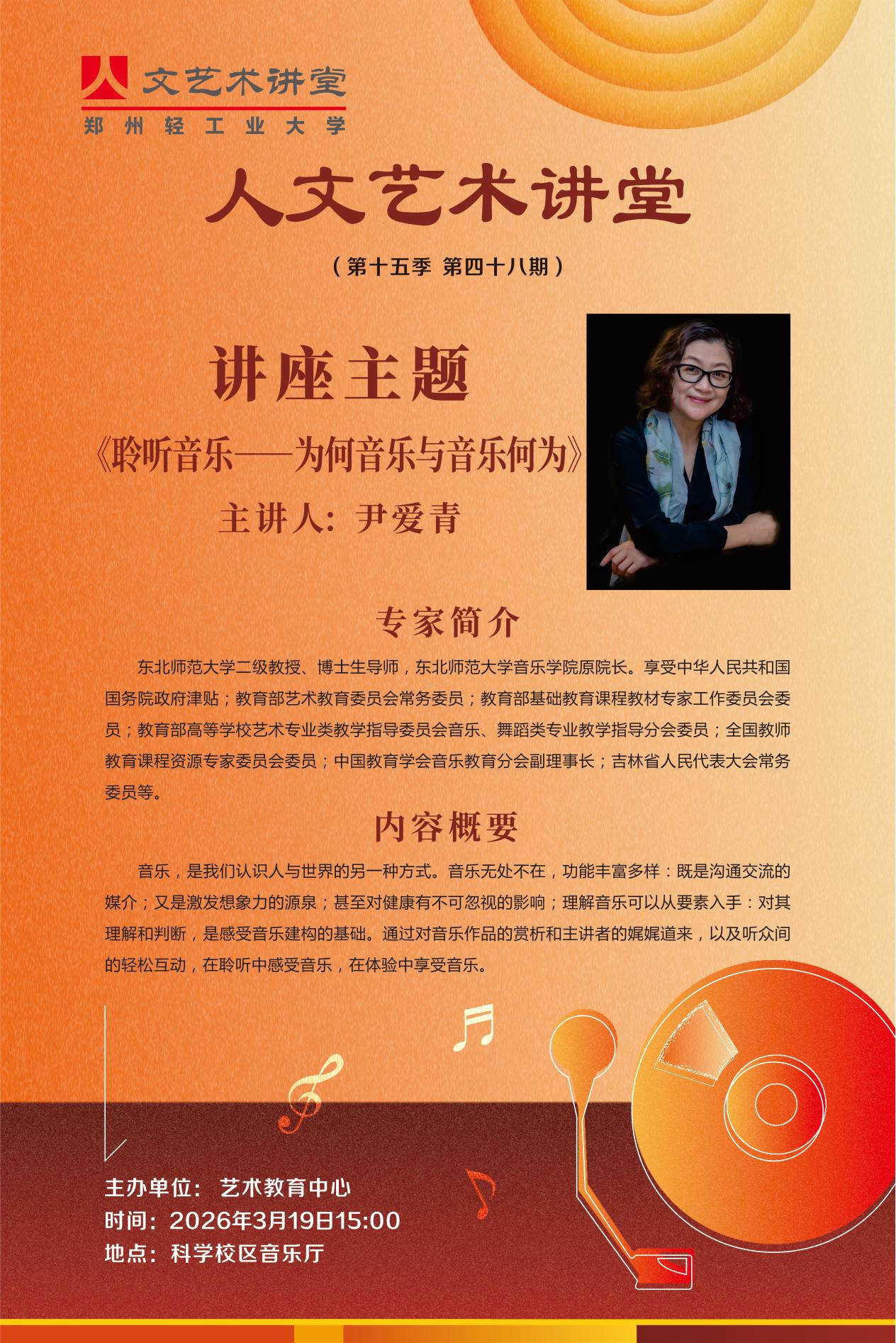 应我校艺术教育中心邀请,教育部艺术教育委员会常务委员,全国高校美育教学指导委员会副主任委员、东北师范大学音乐学院原院长,博士生导师,尹爱青教授,于2026年3月19日(周四)下午15:00,在科学校区音乐厅,开展题为《聆听音乐——何为音乐与音乐何为》的讲座;