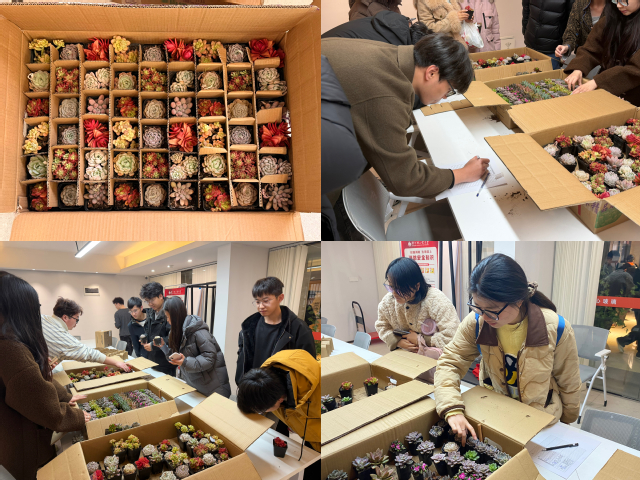 会议室里,一盆盆小巧可爱的多肉和植物种子整齐摆放,静待新主人的认领。负责发放的志愿者的们提前布置好现场,引导同学们有序排队,耐心讲解多肉的养护小知识,并为每一位认领的同学登记信息。现场气氛热烈而温馨,大家捧着心仪的绿植,脸上洋溢着欣喜的笑容。