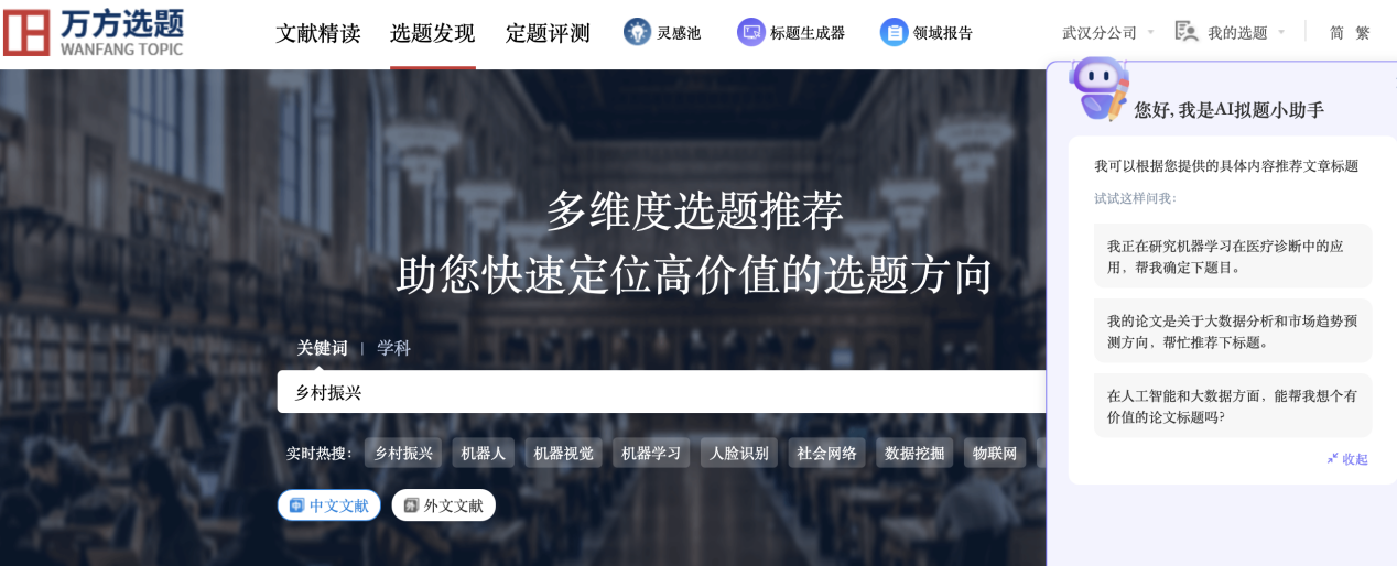 基于海量学术资源与大数据语义分析,提供选题发现、前沿追踪、交叉学科挖掘、文献精读推荐、选题新颖性评测、智能拟题、领域发展报告等功能,一站式解决论文选题、文献阅读、标题拟定与态势分析难题。