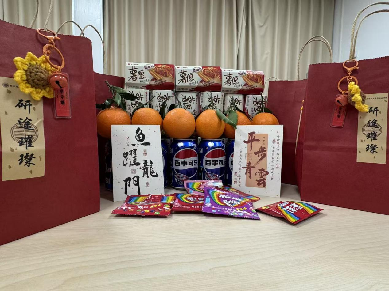 活动筹备期间,低年级同学积极参与。精心包装寓意“旗开得胜”的励志书签、手写祝福贺卡,并准备了象征好运的幸运糖果、心想事“橙”挂饰、百事可乐及苹果、橙子等礼物。每一份礼包都承载着学弟学妹对考研同学“一战成硕、顺利上岸”的真诚祝愿。