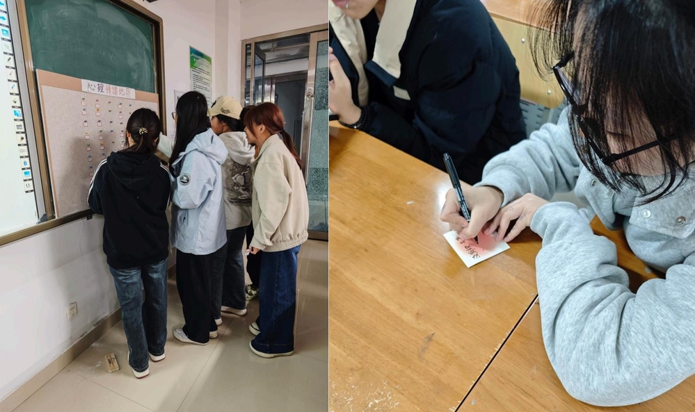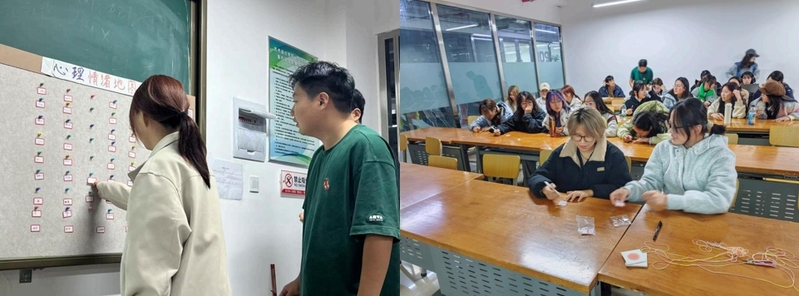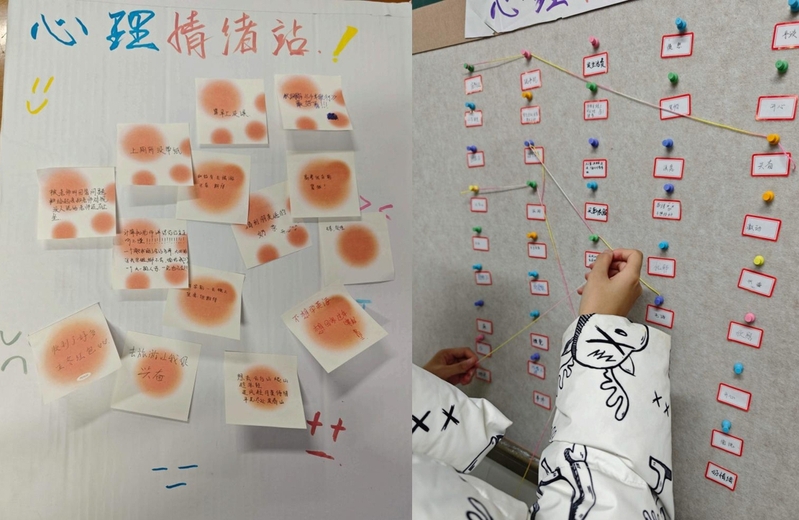活动伊始,“情绪猜猜猜”暖场环节迅速打破人际隔阂,营造了温暖包容的集体氛围。随后,活动紧扣“正视情绪”主题,创新性地采用“可视化的情绪地图”作为载体。在核心环节,同学们将写有“迷茫”、“动力”等关键词的纸条固定在毛毡板上,利用红蓝彩线在不同情绪节点间穿梭缠绕,将抽象心绪具象化,协作织就出一幅错综有序的“班级情绪星云图”。一位同学指着交织的线条感慨:“原来焦虑也能与动力共存。”在随后的“告别仪式”中,大家将写有负面情绪的纸条撕碎并投掷,通过极具仪式感的物理动作,实现了心理包袱的有效释放。
