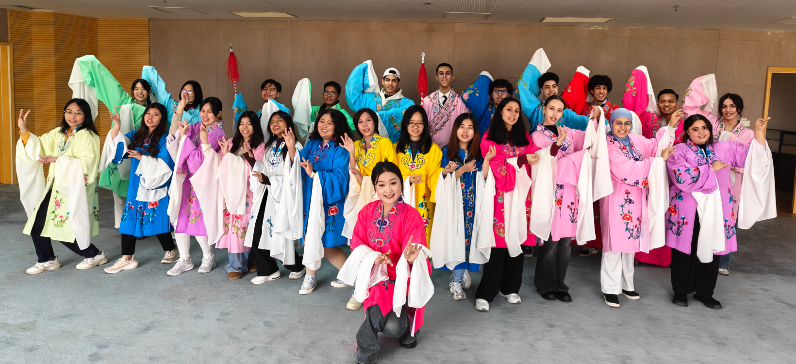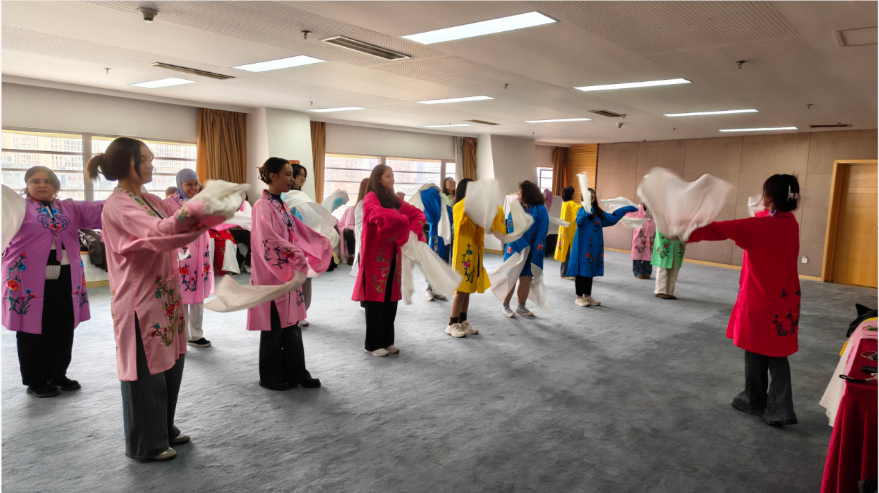 首先,留学生在豫剧老师的指导下穿戴色彩斑斓的戏服,亲身感受传统服饰的精致纹样与文化内涵。老师耐心详解了水袖“欲左先右、欲上先下”的发力技巧,示范抖袖、扬袖等基础动作。留学生们竞相模仿,虽动作青涩,却在水袖翻飞间体会到戏曲肢体语言的韵味。