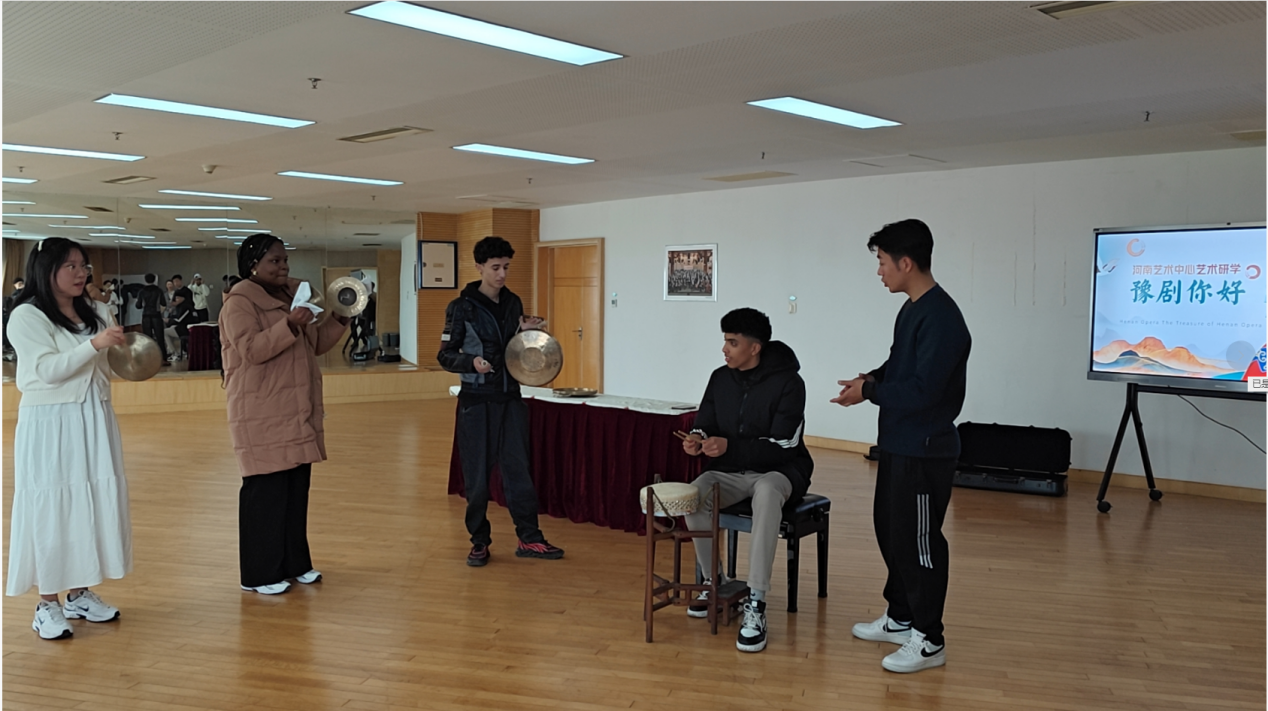 最后是乐器体验环节。各种豫剧特色乐器依次排开,老师讲解每种乐器的音色特点与演奏技法,留学生们轮流尝试演奏,亲身感受豫剧音乐的独特魅力。