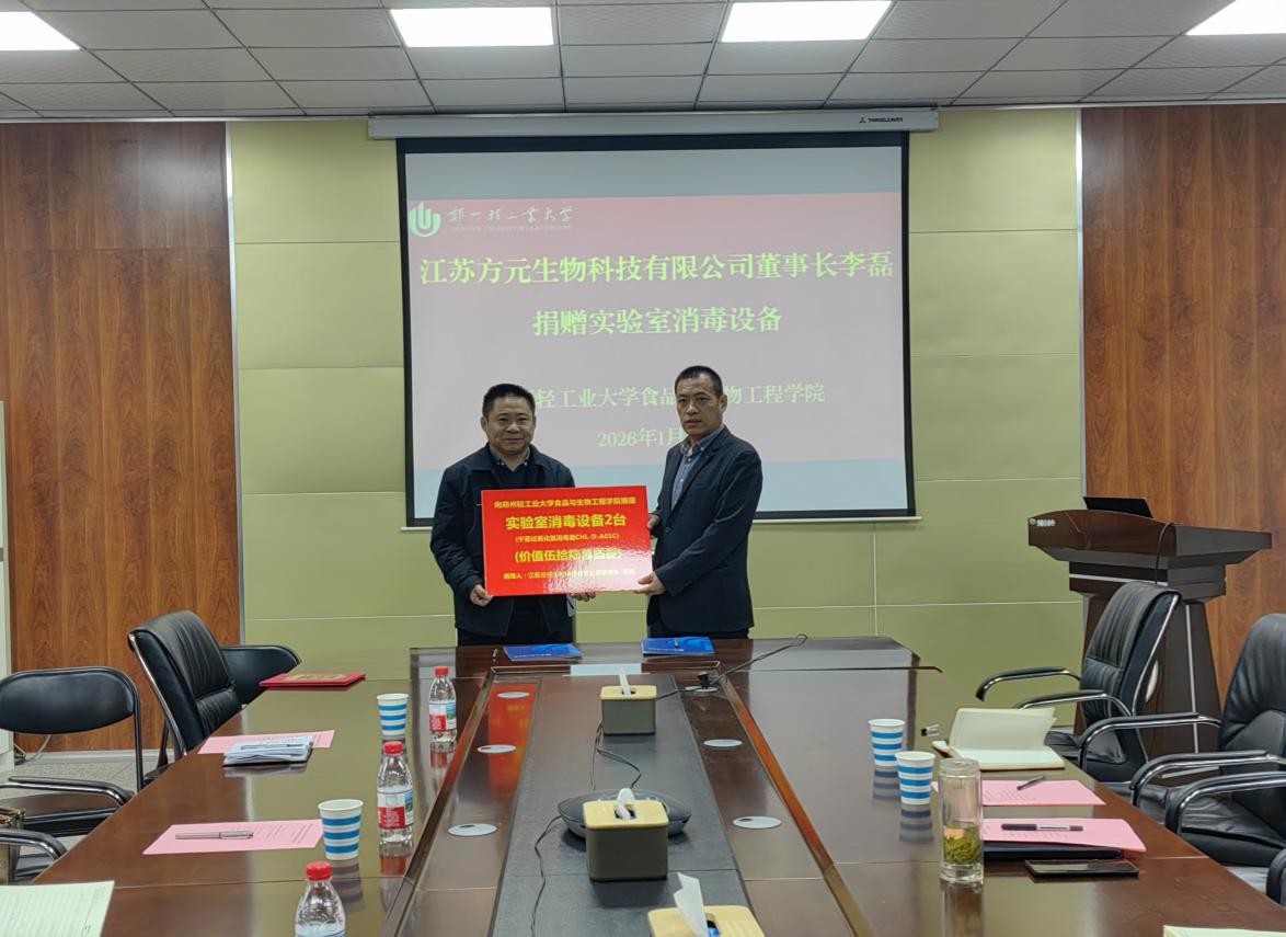 1月13日,食品与生物工程学院与江苏方元生物科技有限公司校企战略合作签约暨捐赠仪式在食工楼211会议室举行。江苏方元生物科技有限公司董事长李磊、商用事业部总监杨莉、商用事业部总经理李春雷等企业高管团队、食品与生物工程学院院长张华、副院长相启森、陶静及相关系部负责人共同出席仪式。