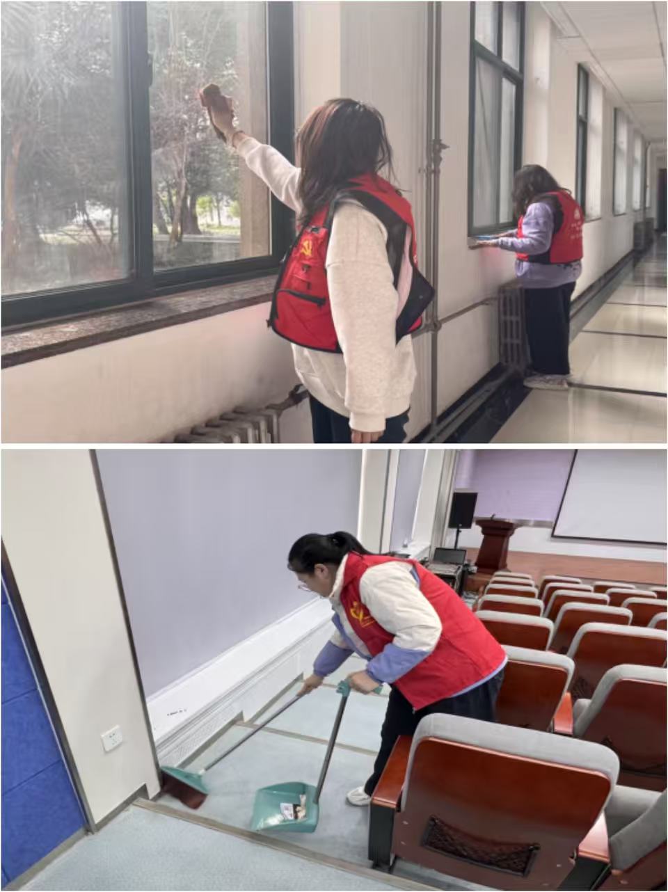 活动现场,志愿者们身着统一红色志愿马甲,分工协作、秩序井然。他们手持扫帚、抹布、拖把等工具,对公共区域进行了全方位细致清理。志愿者们不放过任何一个卫生死角,尽管春寒料峭,但大家热情高涨,干劲十足,红色身影穿梭在楼宇间,成为校园里一道亮丽的风景线。经过一个多小时的辛勤劳动,教二楼窗明几净,环境焕然一新。