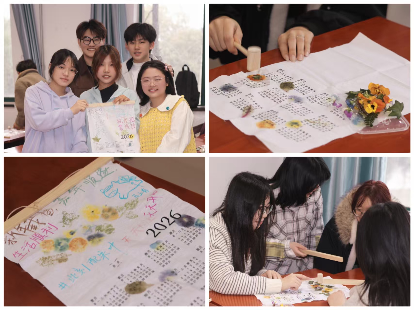 以美润心,以技传情。活动现场,组织者为同学们详细讲解了植物拓印的历史渊源与操作技法。从精心挑选叶片花瓣,到巧妙设计构图布局,再到耐心敲拓定型,每一个步骤都是一次与自然的深度对话。伴随着一次次专注而规律的敲击,日常的学业压力悄然释放,心境也在这份“慢工细活”中逐渐归于平静。拓印完成后,大家纷纷提笔在作品上写下 “成长快乐”“成为更好的自己”等新学期寄语,将美好期许融入亲手创作的艺术作品之中。